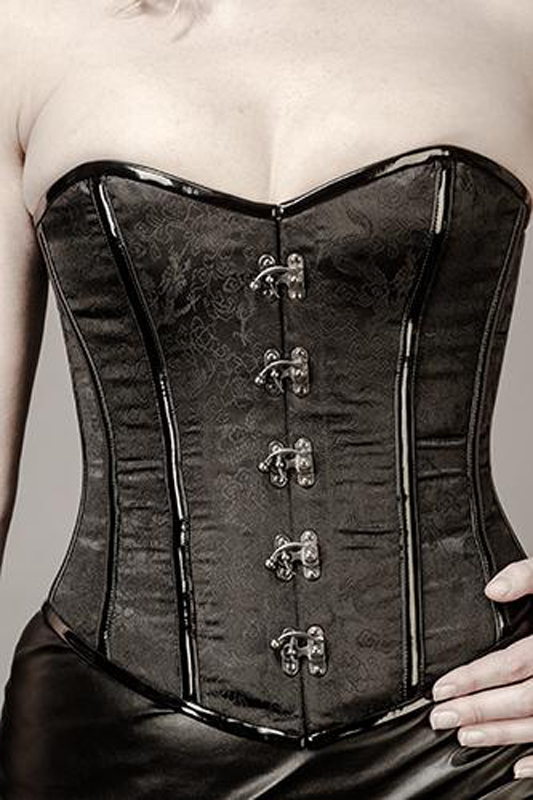 Yksi suosituimmista overbust-korseteistamme, joka hurmaa useimmat ihmiset steampunk-viktoriaanisella tyylillään ja tyylikkäällä mustalla brokadilla, jossa on satiinilohikäärmeitä. Röyhkeät reunukset mustalla lakalla (PVC) sekä saumoissa, helmassa että pääntiessä antavat vahvan persoonallisen ilmeen. Asunnot on korvattu kovilla koukuilla ja tällä korsetilla erotut todella joukosta. Mallissa on korkea leikkaus lantion yläpuolella ja sydämenmuotoinen pääntie on hieman matalampi kuin muissa malleissamme.